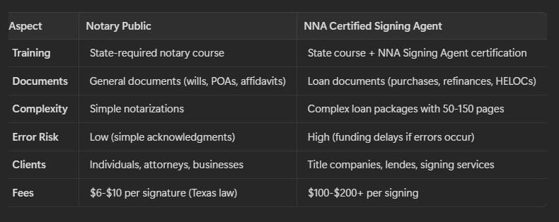 Learn the key differences between a notary public and an NNA Certified Signing Agent in Texas. Understand why loan signings require specialized training and certification.